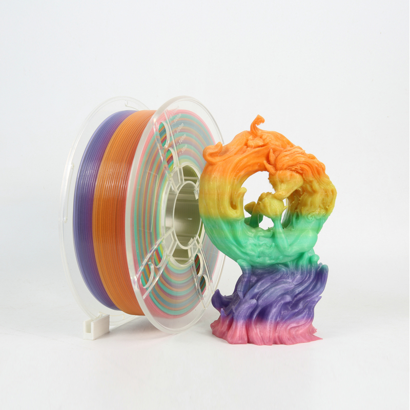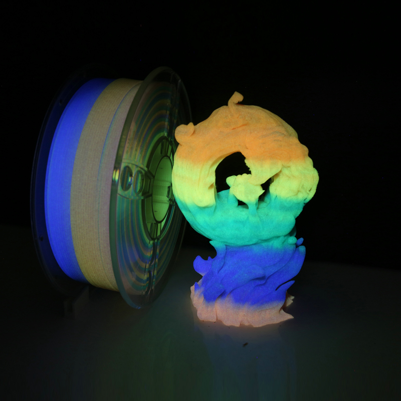 Glow in the dark PLA is easily to change color for day and night. Series including White in day / Colorful in night, Colorful in day/Colorful in night. Monochrome and Rainbow, color is very bright and last longer in night and compare to previous fomular. Rainbow luminous PLA with natural transition.